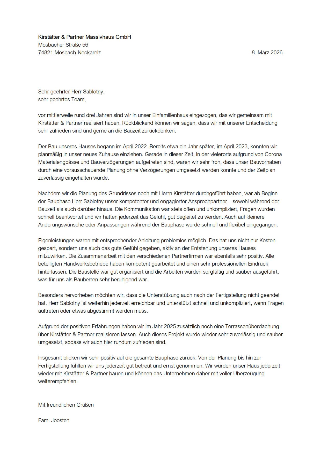 wieder mit Kirstätter & Partner bauen und können das Unternehmen daher mit voller Überzeugung