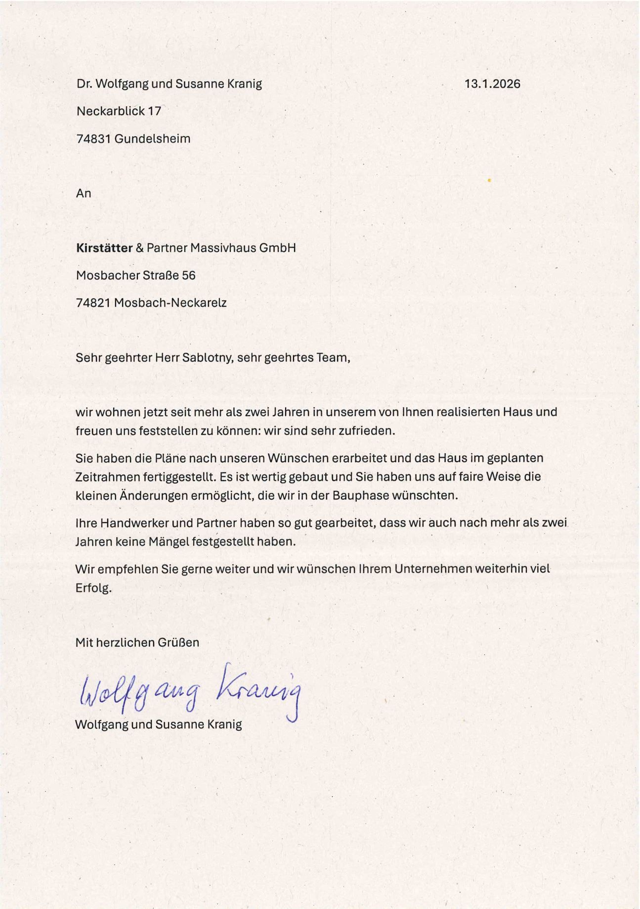 "Viele Bekannte hatten mir abgeraten, als alleinstehende Rentnerin noch so ein Bauvorhaben anzugehen. Beim Bauen würde man sich zu Tode ärgern. Doch davon war während der gesamten Bauzeit nichts zu spüren. Je weiter es mit dem Innenausbau vorangig, desto mehr blühte ich auf. Es war die reine Freude mit Ihnen und Ihren Partnerfirmen zu bauen."